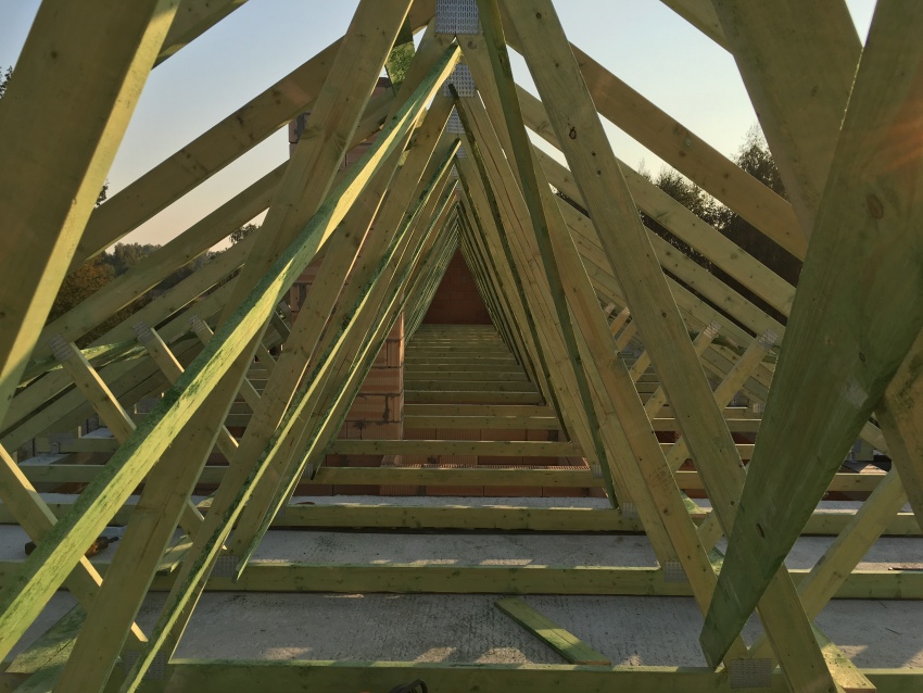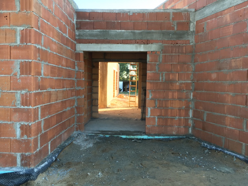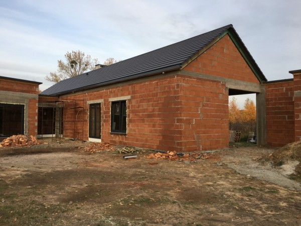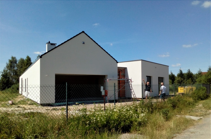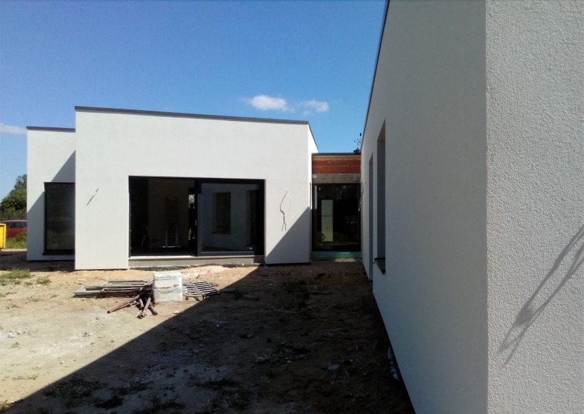 Dom zlokalizowany jest w łódzkiej dzielnicy Widzew. Podstawowym problemem projektowym była uciążliwość przebiegającej nieopodal autostrady A1, dlatego zdecydowaliśmy z Inwestorem, że dom będzie parterowy o rozczłonkowanej bryle, której jedno skrzydło ma pełnić funkcję ekranu akustycznego osłaniającego ogród i najważniejsze części mieszkalne budynku. Z uwagi na trapezowy kształt działki powstał nietypowy układ o nieregularnej strukturze, doskonale spełniający oczekiwania Inwestora, oraz wydzielający zaciszną i intymną część domu. Budynek ma wyraźny podział na strefę dzienną i nocną. Wejście zaprojektowano w łączniku pomiędzy skrzydłami. Naprzeciwko drzwi wejściowych znajduje się duże przeszklenie odsłaniające widok wewnętrznego ogrodu. Zaplanowano jasne, proste i nowoczesne wnętrza, łączące wszystkie części domu z ogrodem.